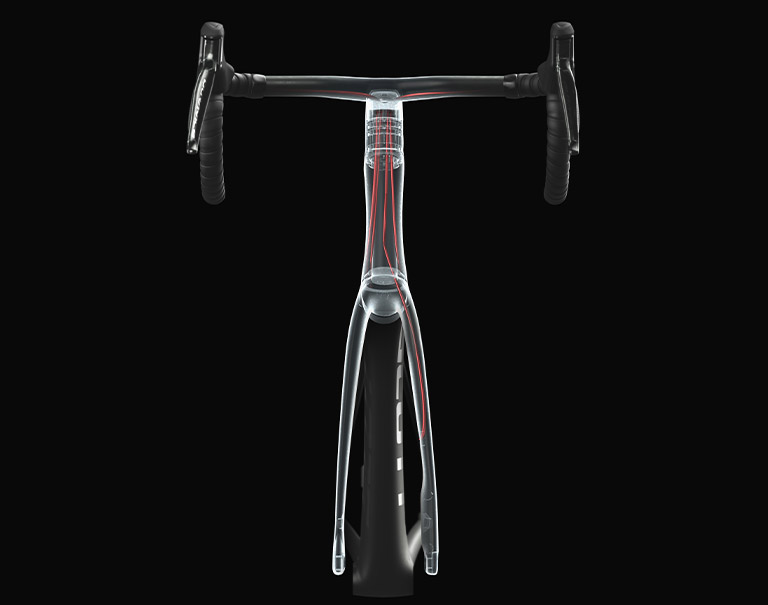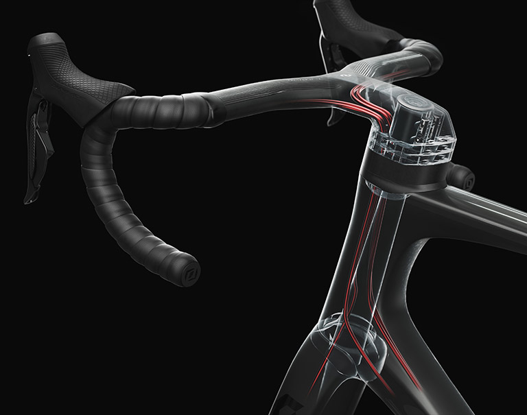 Isso permite o roteamento de cabos totalmente interno para mudanças mecânicas e eletrônicas. O recurso é possível devido ao design do eixo do garfo da bicicleta, patenteado pela SCOTT.