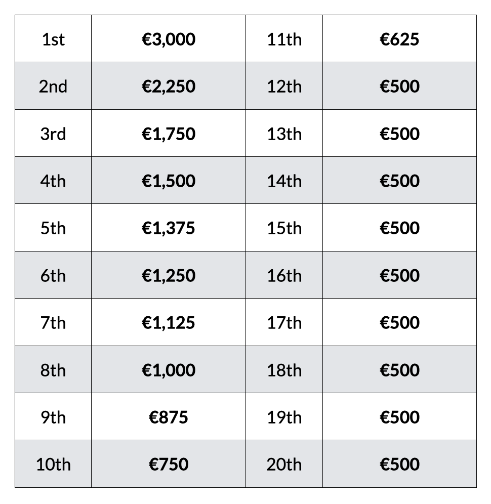 Dado o tamanho do Start List, a bolsa de prêmios adicional será usada para financiar um Conjunto de Bônus pagável além da alocação da bolsa de prêmios existente. De acordo com a estrutura de premiação existente, os seis primeiros colocados serão pagos da seguinte forma: 1º € 3500, 2º € 2100, 3º € 1400, 4º € 1150, 5º € 850 e 6º € 500.