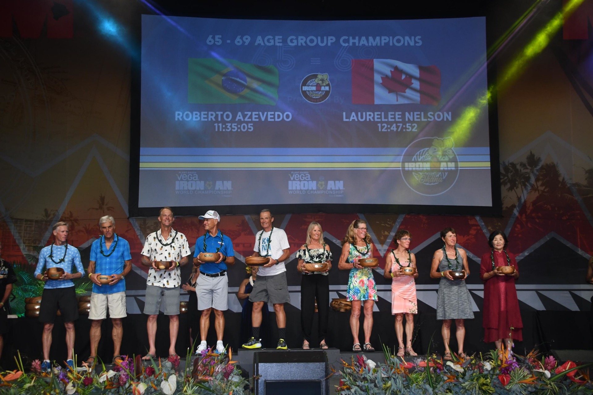 Pódio da categoria 65/69 anos em Kona 2019. Foto: FinisherPix