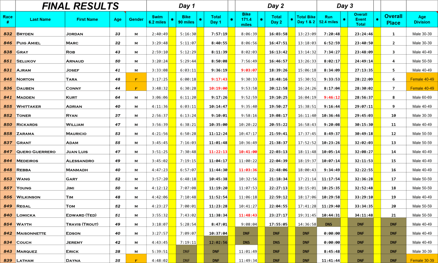 Apesar da distinção nas colocações, o Ultraman é um evento diferenciado, pois não existe premiação em dinheiro e todos os atletas são destacados por terem completado a prova, inclusive, na cerimônia de encerramento, que será hoje, todos os finishers fazem um rápido discurso.
